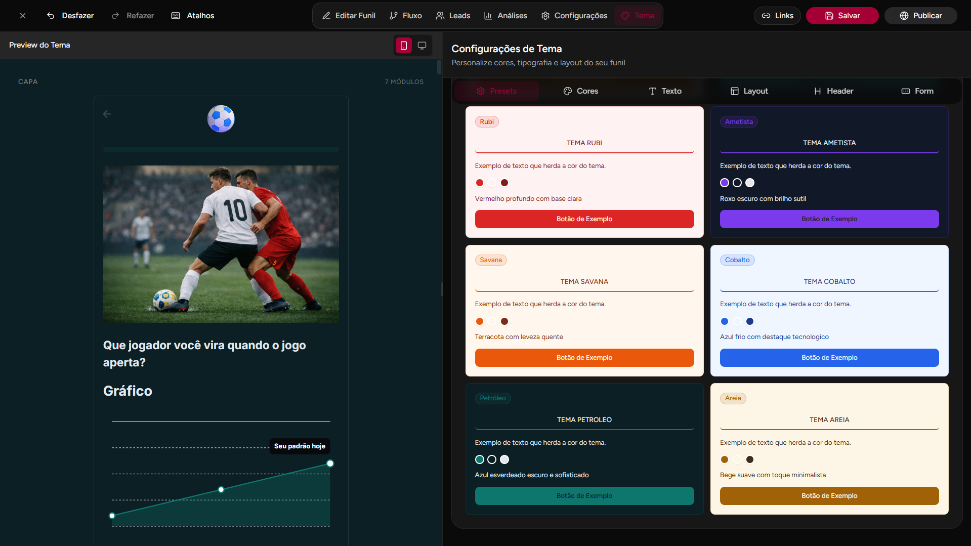 Monte jornadas completas com editor drag-and-drop, sem depender de codigo. Publique rapido e ajuste cada etapa com clareza.